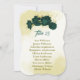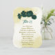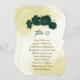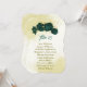 Beautiful wedding seating chart card featuring emerald green flowers and gold leaves.