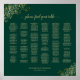 This beautiful wedding seating chart features gold text on an emerald green background with seating assignments for up to 250 guests. It features a simple yet stylish and elegant design with ornate decorative faux foil gold filigree in the corners. The title is written in fancy script calligraphy and reads: Please find your table.