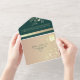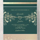 Elegant all-in-one wedding invitation in emerald green with gold floral accents and a romantic rope heart monogram. The design includes space for wedding details, a detachable RSVP card, and a personalised photo back. Please note: this invitation is not self-mailing and requires an A9 envelope. A modern, coordinated choice for couples who want style and convenience in one card.