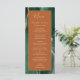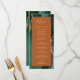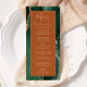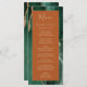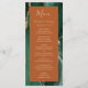 This elegant modern wedding menu features an emerald green watercolor agate background. The customisable text combines gold-coloured whimsical handwriting script with italic and copperplate fonts on a burnt orange or rust background. The reverse side features a matching emerald green and gold agate design.