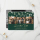 Elegant emerald green and gold wedding photo save the date card. Our wedding save the date features a photo collage of 3 images against an emerald green background adorned with string lights on the front and one photo at the back. Easily personalise this emerald green save the date card with your photos and wedding details.