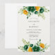 This design features a rich palette of deep emerald green and golden yellow watercolor blooms. Lush ranunculus and roses are nestled among vibrant green leafy branches for a nature-inspired aesthetic. The top and bottom floral arrangements create a balanced and sophisticated botanical atmosphere.