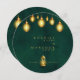 This round wedding menu card is like a little piece of magic! The front has a beautiful emerald green background with sparkling golden lights twinkling above, giving it a magical feel. You'll find the couple's names elegantly written, along with the wedding date and the venue. The back is also emerald green, with the same enchanting golden lights. At the top, it says 'The Menu' in a beautiful font. Below, you'll find a list of all the delicious dishes, from starters to desserts, all written in elegant gold. It's a truly special touch for your wedding celebration.