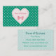 A cute emerald green polka dot pattern with a heart shaped patch stitched in pink and embellished with a pretty in pink bow. Personalise by adding your business name to the front. Flat printed image, not actual ribbon.