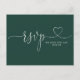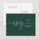 An elegant heart script on an emerald green background RSVP card. The reverse features your details and a fun guest song request. Designed by Thisisnotme©