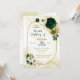 Beautiful emerald green ivory white and gold flowers with gold leaves on a gold geometric frame birthday party invitation.