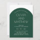 Modern typography arch wedding invitation and details with QR Code on back side in shades of Emerald green, Sherwood Green, Bottle Green, Sacramento State Green colours. Suitable for summer botanical garden wedding theme.