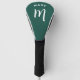 Customise your golf head cover with your initial monogram and name. Designed with a bold white script font on an emerald green background.