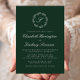 This elegant wedding invitation design features a white script monogram initial encircled by a line art botanical wreath on an emerald green background. The names appear in white script, with the rest of the text in classic serif font. The back of the card is solid emerald green.