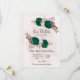 Beautiful romantic wedding save the date invitation featuring emerald green and pink flowers and some leaves .