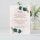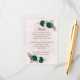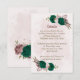 Beautiful romantic wedding reception details enclosure card featuring emerald green and pink flowers and some leaves .