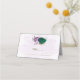 Beautiful romantic wedding place card featuring emerald green and purple flowers and some leaves .