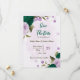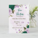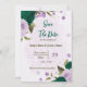 Beautiful romantic wedding save the date invitation featuring emerald green and purple flowers and some leaves .