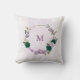 Beautiful romantic throw pillow featuring emerald green and purple flowers and some leaves .