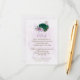Beautiful romantic wedding reception details enclosure card featuring emerald green and purple flowers and some leaves .