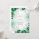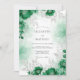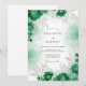 This design features a rich emerald green and silver palette set against a soft watercolor wash. Lush peonies and delicate foliage create a sophisticated botanical look throughout the layout. Ethereal splatters and painterly textures evoke the feeling of a misty woodland morning. The combination of deep jewel tones and shimmering metallic-inspired leaves offers a modern aesthetic for a winter or spring event.