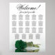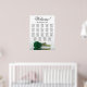 Enhance the elegance, sophistication, and charm of your wedding reception with this exquisite seating chart. This stunning contemporary floral design showcases a romantic long-stemmed emerald green rose resting horizontally and reflecting in a serene water pool. It can accommodate up to 190 guests, seated at 19 tables with 10 seats per table. The graceful calligraphy title states "Welcome! Please find your table" with room for the couple's names and wedding date at the bottom.