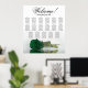 This beautiful wedding seating chart has 17 tables and an exquisite design that showcases a solitary long stemmed deep emerald green coloured rose lying horizontally, reflecting on a pool of water. The title is written in fancy script calligraphy and says "Welcome!" with the couple's names and wedding date at the bottom. The seating arrangement has a traditional layout that accommodates 170 guests with 10 seats per table. This romantic, elegant, and stunning seating chart is a lovely gesture to greet your wedding guests and help them find their seats with ease at the reception.