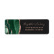 The left-hand edge of this elegant modern wedding invitation return address label features an emerald green watercolor agate border trimmed with faux rose gold glitter. The customisable text combines rose pink handwriting script and copperplate fonts on a slate black background.