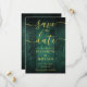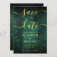 This elegant emerald green rustic barn wood boho wedding save-the-date card can be personalised with your information in chic gold typography. Designed by Thisisnotme©