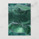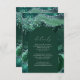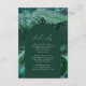 This design features an emerald green arch on a background of green watercolor agate strata sprinkled with silver faux glitter. The word "details" appears in elegant white calligraphy script. Add your wedding information in white italics. The back of the card repeats the green and silver background design.