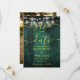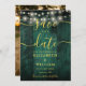 This elegant emerald green string lights rustic barn wood boho wedding save-the-date card can be personalised with your information in chic gold typography and special photo on the reverse. Designed by Thisisnotme©