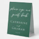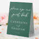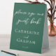 This personalised solid emerald green wedding PLEASE SIGN OUR GUEST BOOK table tent sign features classic white script for a couple getting married in a forest or other nature venue. Celebrate your love with this tranquil colour and coordinate with our custom minimalist typography collection.