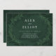 Gorgeous dramatic laurels frame this elegant wedding invitation with a deep emerald green watercolor wash background.