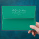 Chic, modern and simple wedding return address envelope with your names in white elegant handwritten script calligraphy on an emerald green background. Simply add your names and address. Exclusively designed for you by Happy Dolphin Studio. If you need any help or matching products please contact us at through our store chat. We're happy to help you make your wedding the most beautiful day!