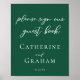 This personalised solid emerald green wedding PLEASE SIGN OUR GUEST BOOK poster features classic white script for a couple getting married in a forest or other nature venue. Celebrate your love with this tranquil colour and coordinate with our custom minimalist typography collection.