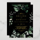 This emerald greenery gold foil black casual wedding invitation is perfect for a boho wedding. The elegant yet rustic design features moody dark green watercolor leaves and eucalyptus with a modern bohemian woodland feel. Featuring luxurious gold foil text.
