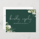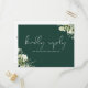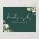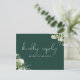 An elegant song request RSVP card featuring floral greenery and chic typography on an emerald background. The reverse features your details and a fun guest song request. Designed by Thisisnotme©