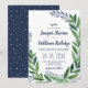 Spring wedding invitation with a hand-drawn greenery wreath filled with watercolor texture surrounding your invitation wording in dark blue.
