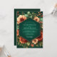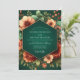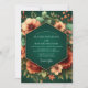 Experience a rich and moody atmosphere with this elegant design. A deep emerald backdrop makes the warm terracotta and peach poppies pop with a luminous quality. Lush, painterly foliage and delicate buds complete this romantic and artistic composition, perfect for an autumnal affair.