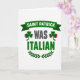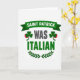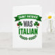Designed with a bright white background, this St. Patrick’s Day card centres a cheeky statement that reads “SAINT PATRICK WAS ITALIAN” in stacked lines. “SAINT PATRICK” sits across the middle on a deep emerald ribbon banner, and the letters are white so they stand out clearly. Just below, “WAS” appears in charcoal grey, quietly bridging the top line to the last word like a pause before the punchline. Two small shamrocks sit to either side of “WAS,” coloured rich green with a tiny red crescent accent that nods to Italy and adds a wink of inside-joke charm 💚. “ITALIAN” anchors the lower section in a brighter green, giving the bottom line extra weight and making the twist feel confident. A dark green laurel wreath curves around the lower text, adding a classical touch that can feel like a clever toast shared between close friends ☘️. The layout is symmetrical and tidy, with flat shapes, sharp edges, and the laurel leaves forming an oval frame around the lower half of the wording.