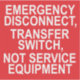 This is an EMERGENCY DISCONNECT, TRANSFER SWITCH, NOT SERVICE EQUIPMENT sticker label for electricians to use when installing a whole-house generator. It has white letters on a red background.