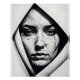 A minimalist, high-contrast ink drawing capturing the serene yet intense gaze of a woman’s face viewed through large, abstract tears in fabric. Soft folds and shadows of the cloth frame her features, symbolizing emergence and transformation. The torn edges flow organically, blending raw emotion with elegant simplicity, creating a powerful visual of resilience and change.