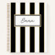 Elevate your journalling or note taking experience with our Emma Stripe Collection hardcover notebook personalised with your name. Featuring classic black and white stripes with khaki accents, this versatile notebook offers customisation options such as bullet journal, wide or college ruled lines, checklist pages, recipe pages, and more. With its durable hardcover, it's the perfect blend of style and functionality for any task at hand. Make your mark with this chic and organised essential.