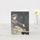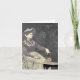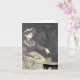 A vintage, black and white photo of a woman in a large hat and old-fashioned work dress and apron, with one hand in her lap, and one hand resting on a jar with a brain in it. Behind her is a chalkboard with faint anatomical drawings. The inside reads, "Emma's plans to reanimate a corpse came to a halt, when she realised she actually preferred living alone. Happy Halloween."