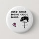 a white button with black writting the says "emo kids have cool hair" also has a stick figure and a heart