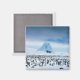 This photo features an emperor penguin colony with frozen icebergs as a backdrop.