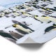 This photo features an emperor penguin colony with frozen icebergs as a backdrop.