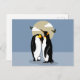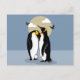 A cute illustration of emperor penguins nesting on the ice. An egg rests on the penguins feet.