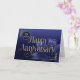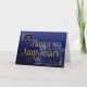 This is an Employee 10th Anniversary card featuring the text 'Happy Anniversary' written in an elegant font with flowing swashes. The text and details of the design have an attractive gold foil effect overlay. The background consists of a mid to dark blue gradient, with an eye catching lily flower, in matching shades of blue, in the lower right hand corner. The number of years is in the upper left.