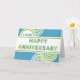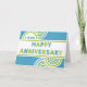 This is a bright, eye catching, employee 4th anniversary card in blue, green and white. The design features the centrally placed text 'HAPPY ANNIVERSARY' in a layered effect font. Above and below this text are circular, decorative elements in matching colours to the text. The number of years is written within the lower of the two circular shapes above the central text.