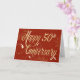 This is a fun Employee Fiftieth Anniversary Card featuring the text 'Happy 50th Anniversary', written in a swirly font with a digitally added gold foil effect overlay. The text is set against a red background with a feint swirly pattern. In addition, there are three star bursts each of which has a digitally added gold sparkle effect. All in all a fun, bold and celebratory design.