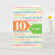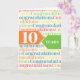 This is a colourful Employee Anniversary 10 Years Congratulations card. The background congratulations pattern features the repeated word 'Congratulations' written in red, orange, yellow, green and jade against a white background. The text '10 YEARS' is written on two centrally placed point tipped labels, one in orange and one in green, with a drop shadow to give the illusion of the labels standing out from the background.