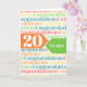 This is a colourful Employee Anniversary 20 Years Congratulations card. The background congratulations pattern features the repeated word 'Congratulations' written in red, orange, yellow, green and jade against a white background. The text '20 YEARS' is written on two centrally placed point tipped labels, one in orange and one in green, with a drop shadow to give the illusion of the labels standing out from the background.