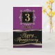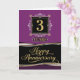 The design has been created within a plum colour scheme and features the number 3, centre top, in a decorative text box. The number is written in an elegantly curved font with a digitally created gold foil effect overlay against a black background. Underneath the number is the word 'YEAR', in a matching font and overlay to the number, and set against a dark jade background. In the lower section of the design, on a gently curved, multi-bordered text box, is the text 'Happy Anniversary', written in a beautifully flowing, script style font, with decorative swashes. This text too has a digitally created, gold foil effect, overlay and is set against a black background.
