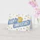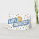 This is a fun employee 40th anniversary card in mainly blue and white. The words 'HAPPY' and 'ANNIVERSARY' are written in white on two separate, blue text boxes which are placed on the slant, horizontally across the card. The '40th' is written in white on a tan coloured, eight point, star and placed to the right of the word 'HAPPY' and above the word 'ANNIVERSARY'. There is also a narrow gold sparkle effect border towards the edge of the star. The text boxes and star have a minimal drop shadow which gives the effect of being slightly raised from the background. The background pattern is mainly blue and white but there is also some creatively contrasting yellow and tan in the mix too.